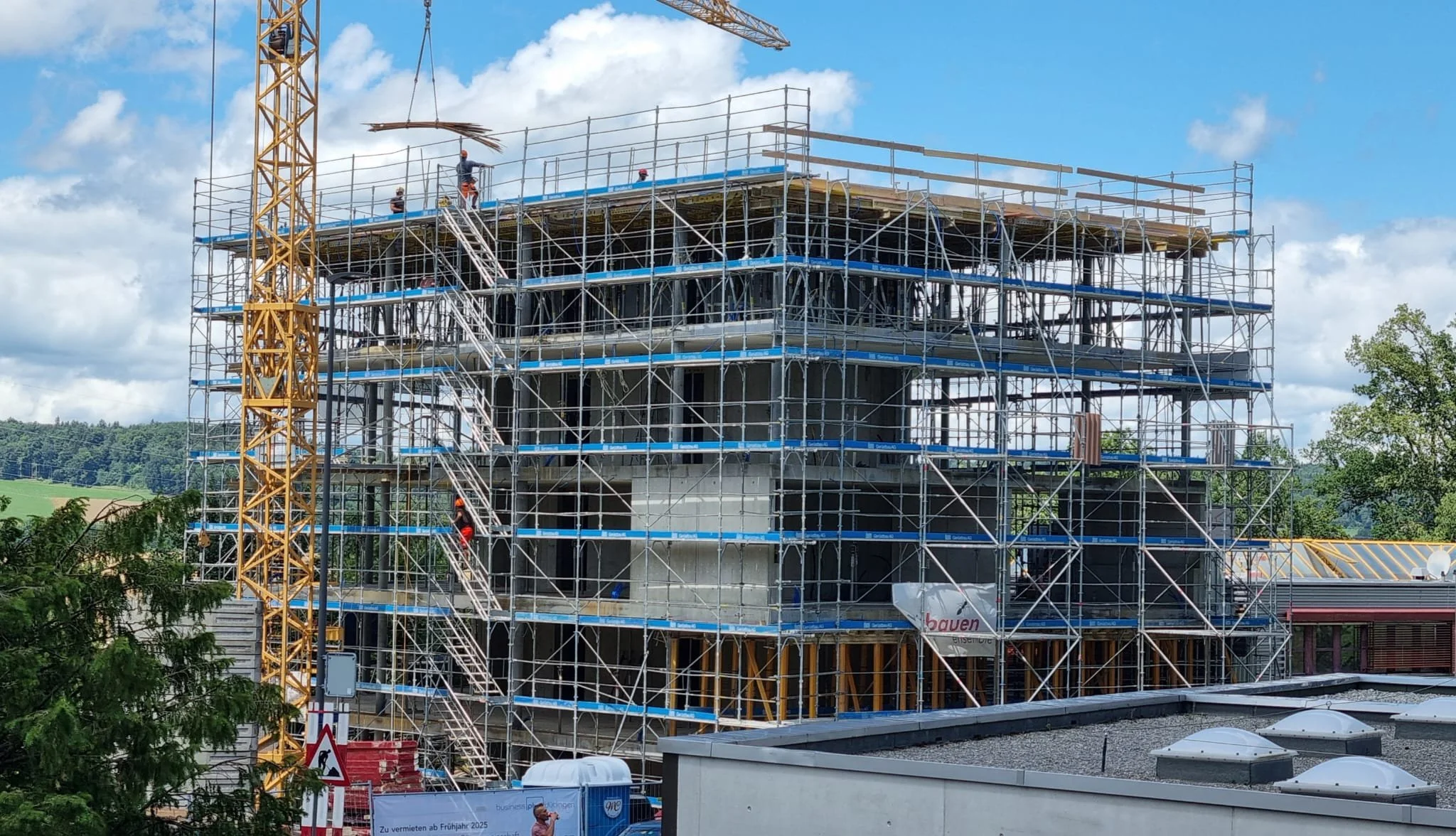 Am 20. September feierten wir einen weiteren Meilenstein: In festlicher Stimmung versammelten sich über 70 Personen – Bauherrschaft, Handwerker, Planer, Architekten und zukünftige Mieter –, um den erfolgreichen Fortschritt unseres Projekts zu feiern. Mit Freude und Stolz wurde auf die bisherigen Leistungen angestossen, die den modernen Gewerbepark in Düdingen Schritt für Schritt zur Realität werden lassen. Das Aufrichtfest bot die Gelegenheit, die gute und enge Zusammenarbeit und das Engagement aller Beteiligten zu würdigen. Gemeinsam blicken wir voller Vorfreude auf die nächsten Etappen und freuen uns auf die Fertigstellung des Gebäudes im Laufe des nächsten Jahres.